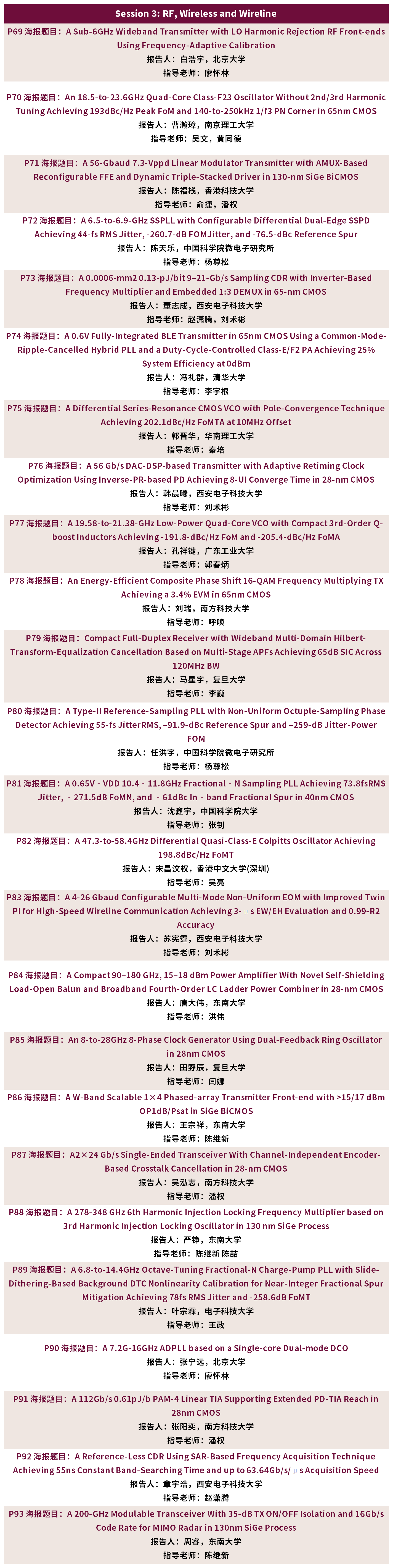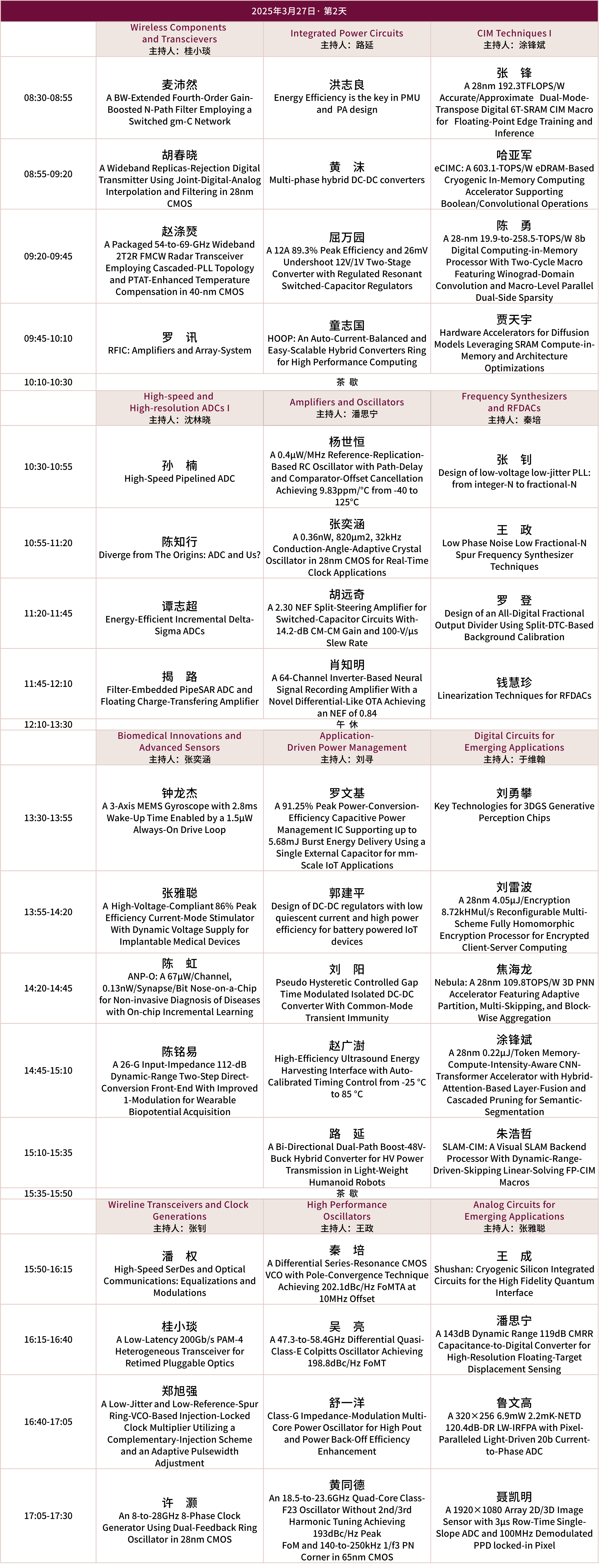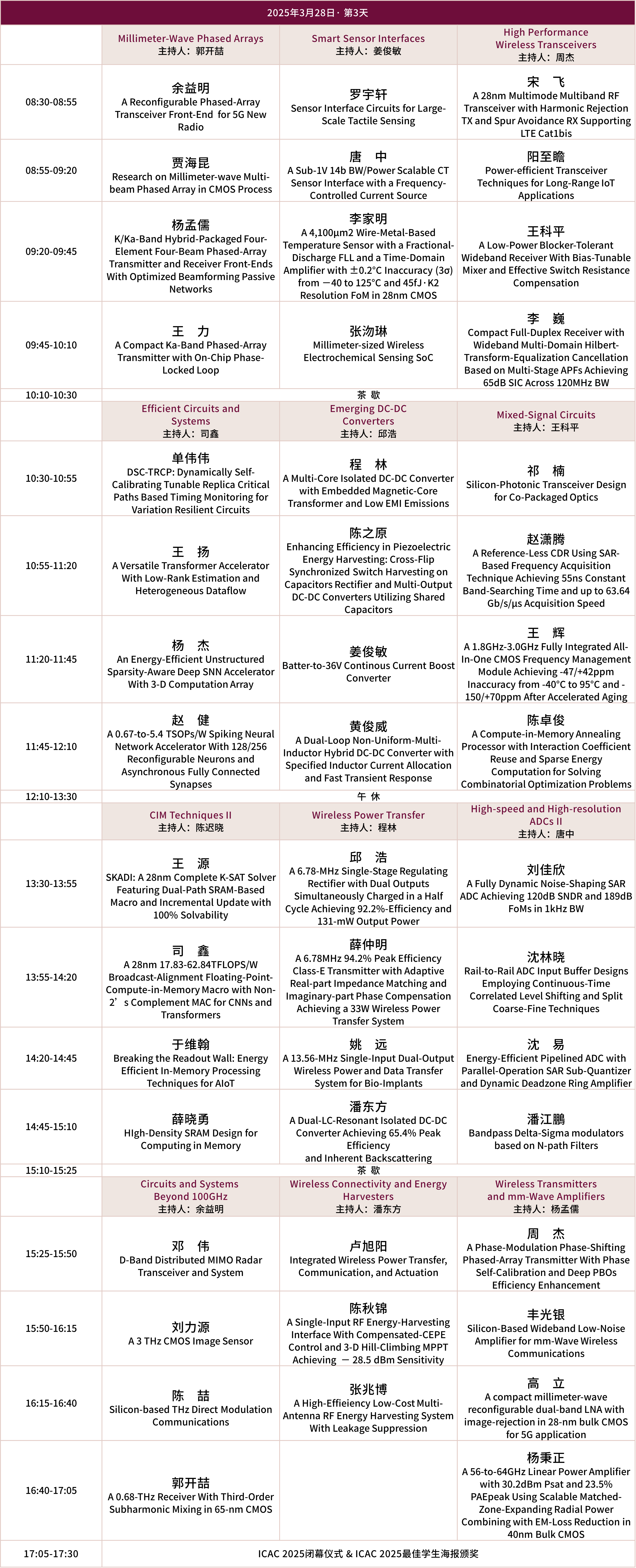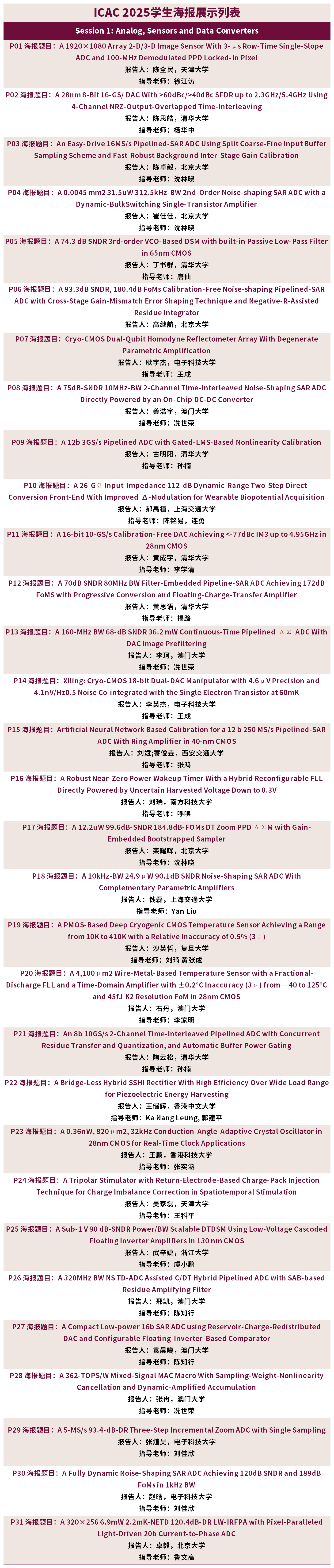 谭志超,浙江大学 Zhichao Tan (Senior Member, IEEE) received the B.Eng. degree from Xi’an Jiaotong University, Xi’an, China, in 2004, the M.Eng. degree from Peking University, Beijing, China, in 2008, and the Ph.D. degree from Delft University of Technology, Delft, The Netherlands, in 2013. He was a Staff IC Design Engineer working on low-power, high-precision analog/mixed-signal circuit design with Analog Devices Inc., Wilmington, MA, USA, from 2013 to 2019. He joined Zhejiang University, Hangzhou, China, as a Faculty Member in 2019. His research interests include energy-efficient sensor interfaces, precision analog circuits, and ultra-low-power analog-to-digital converters (ADCs). This has resulted in over 85 technical journal and conference papers. He holds five U.S. patents.Dr. Tan is a TPC member of the IEEE Custom Integrated Circuits Conference. He was a TPC member of the IEEE Asian Solid-State Circuits Conference. He has served as Associate Editor for the IEEE TRANSACTIONS ON CIRCUITS AND SYSTEMS-I: REGULAR PAPERS, IEEE Sensors Journal, and IEEE TRANSACTIONS ON INDUSTRIAL ELECTRONICS.